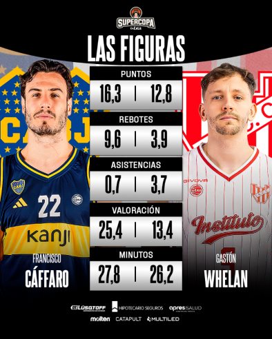 Por el lado de Instituto, Whelan se consolidó como uno de los motores ofensivos. El perimetral registra 12,8 puntos, 3,9 rebotes y 3,7 asistencias por encuentro, con 13,4 de valoración en 26,2 minutos de promedio. Su capacidad para asumir responsabilidades en momentos claves y generar juego lo convierten en una pieza central de cara a la final.